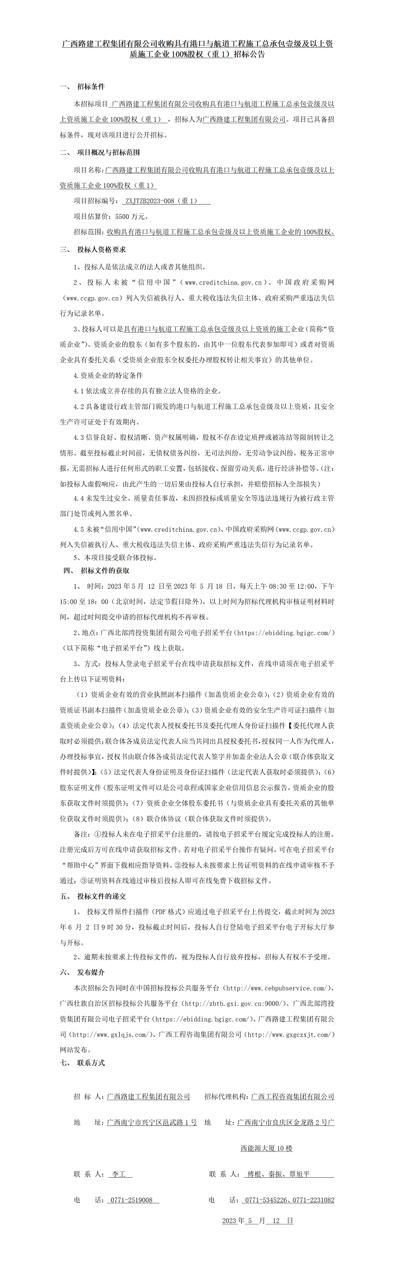 廣西路建工程集團有限公司收購具有港口與航道工程施工總承包壹級及以上資質(zhì)施工企業(yè)100%股權(重1)招標公告