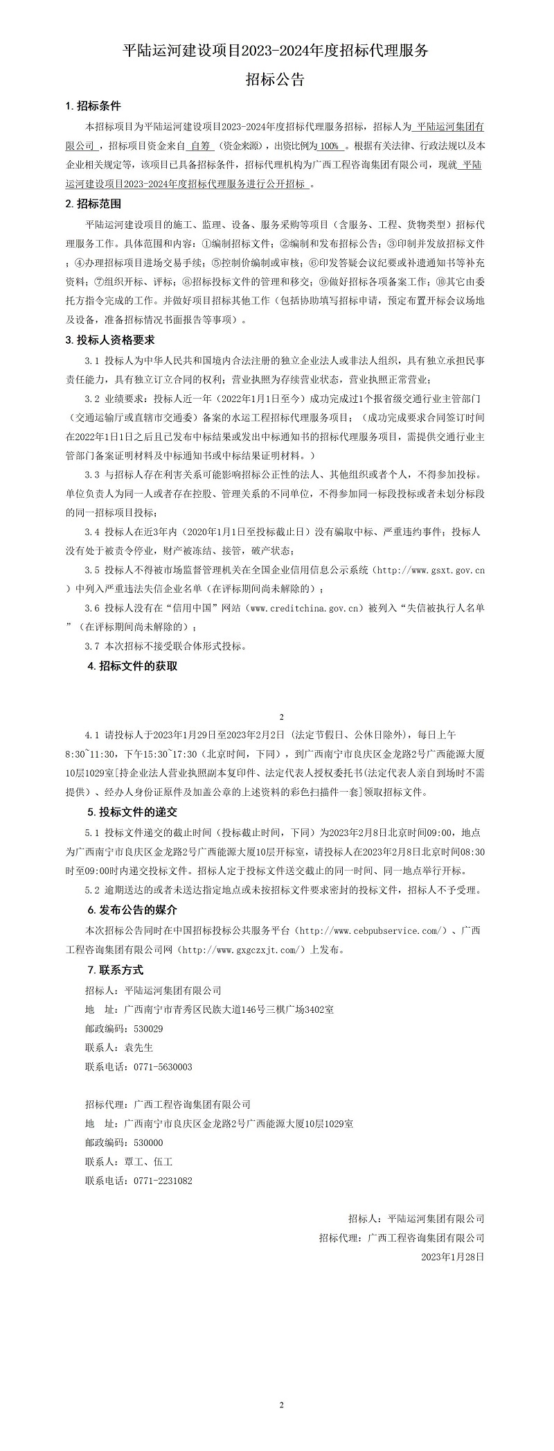 平陸運河建設項目2023-2024年度招標代理服務招標公告