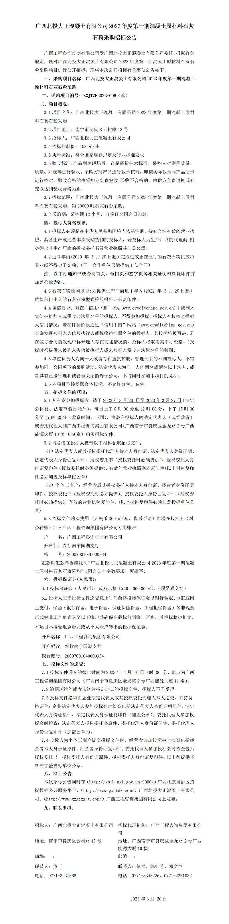 廣西北投大正混凝土有限公司2023年度第一期混凝土原材料石灰石粉采購招標(biāo)公告