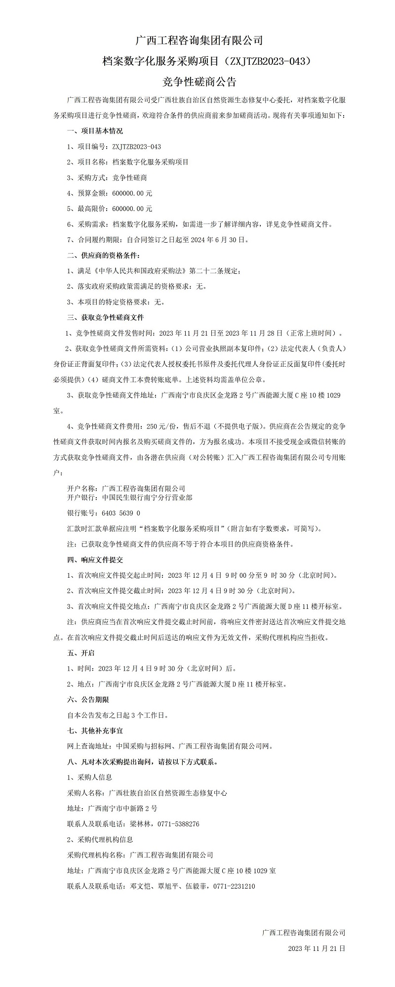 廣西工程咨詢集團有限公司檔案數(shù)字化服務(wù)采購項目(ZXJTZB2023-043)競爭性磋商公告
